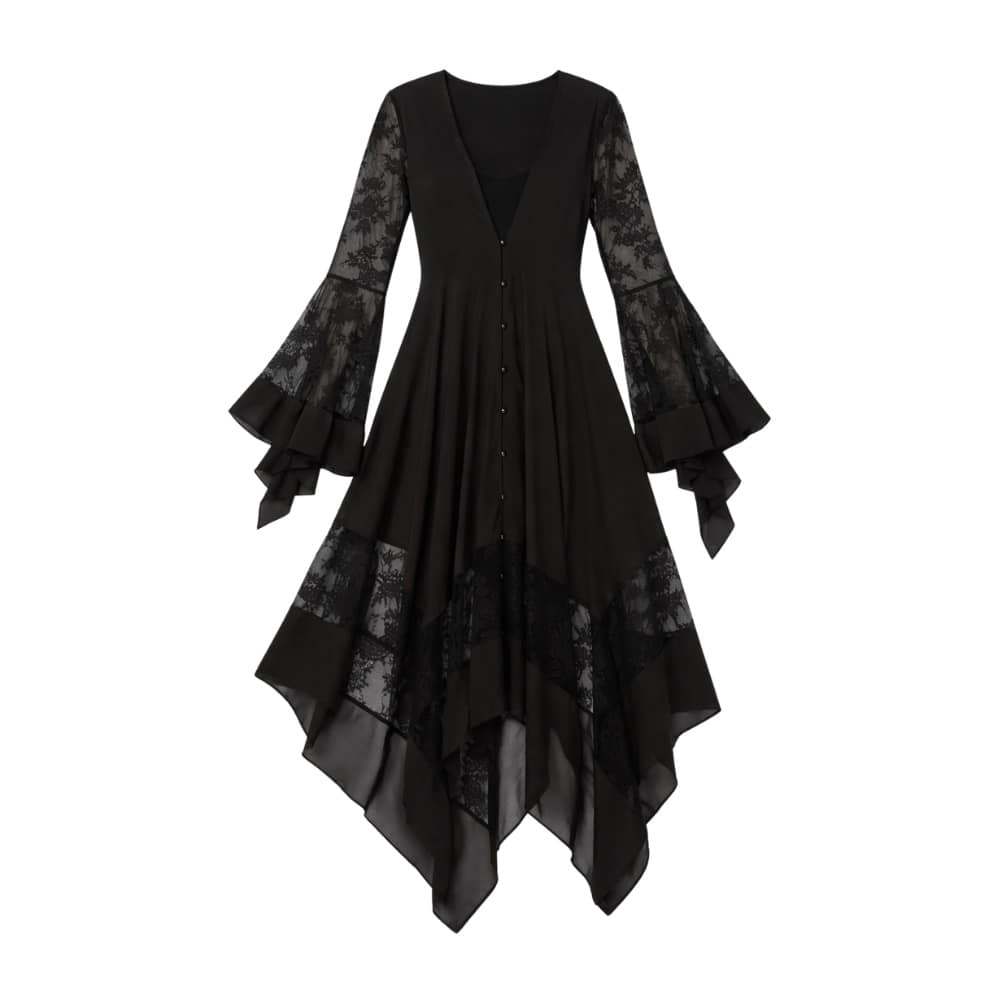 This flowing gothic lace dress provides a fabulous silhouette, with intricate lace detailing that feels mysterious and elegant.